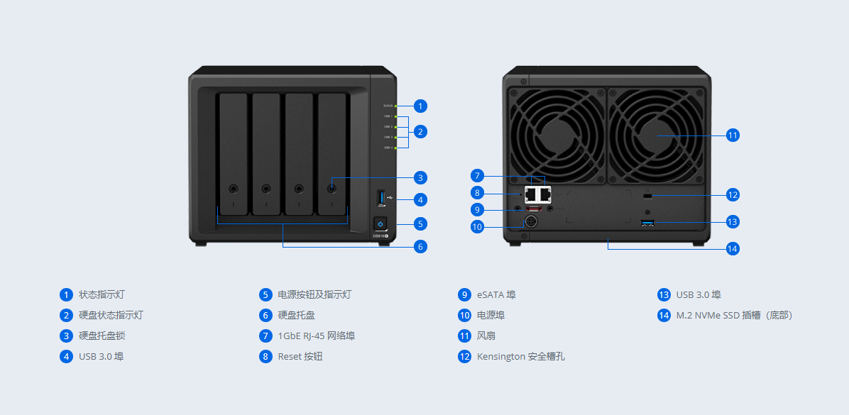 | 其他特点 | 全新机构设计,提供两个M.2 2280 NVMe插槽供SSD快取扩充;支援2路4K H.264/H.265影像转档;连接DX517最高可扩充至9颗硬碟 |